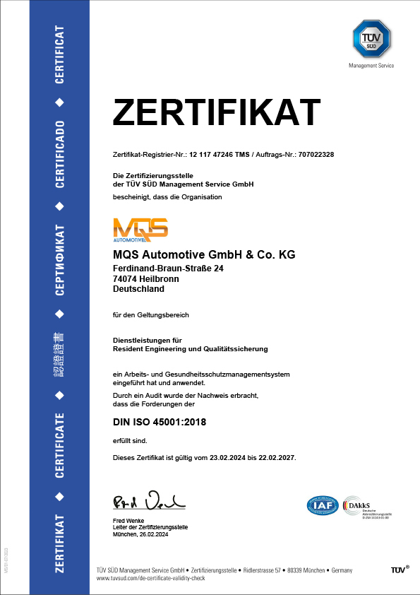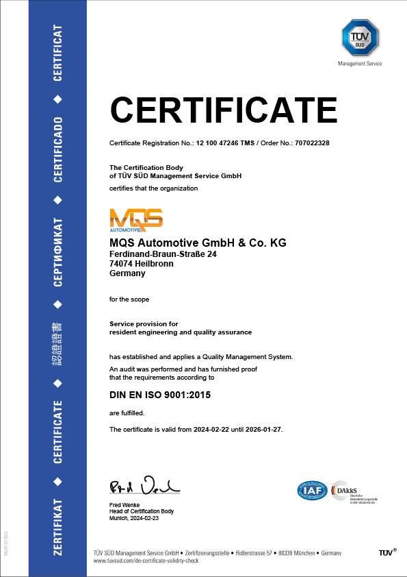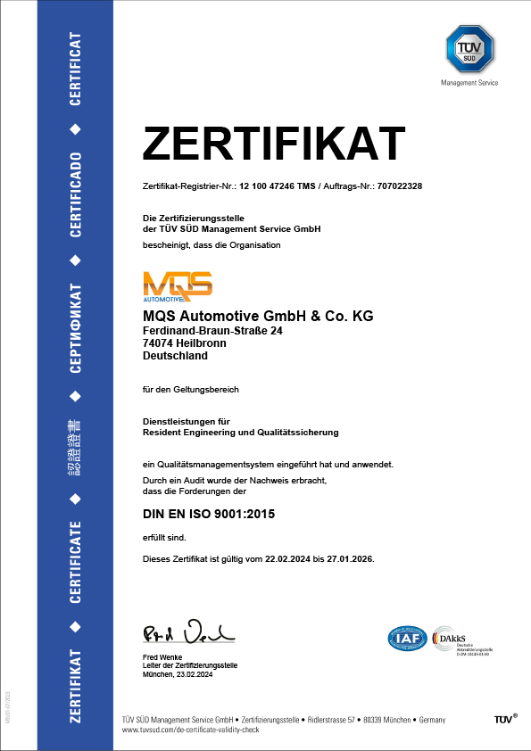 Diese Zertifizierung bestätigt von offizieller Stelle, dass MQS in allen relevanten Bereichen die strengen Anforderungen an Qualitätsmanagement erfüllt. Für Sie bedeutet das die Gewissheit, dass Sie mit uns einen Partner an Ihrer Seite haben, dessen Leistungen kontinuierlich geprüft und optimiert werden. So können Sie sich darauf verlassen, dass wir Ihnen stets die höchste Qualität und die versprochene Zuverlässigkeit liefern.